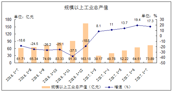 1-7月,规模以上工业总产值完成73.89亿元,同比增长17.3%,较上年同期上升35.9个百分点,较1-6月下降2.1个百分点。