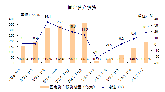 1-7月,完成固定资产投资190.26亿元,同比增长18.7%,较上年同期上升17.1个百分点,较1-6月上升10.3个百分点。