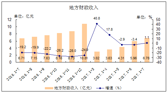 1-7月,地方财政收入6.78亿元,同比增长1.1%,较上年同期上升20.3个百分点,较1-6月上升4.5个百分点。