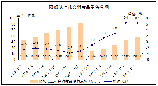 1-7月,限额以上社会消费品零售总额完成56.14亿元,同比增长6.3%,较上年同期上升8.8个百分点,较1-6月下降0.1个百分点。