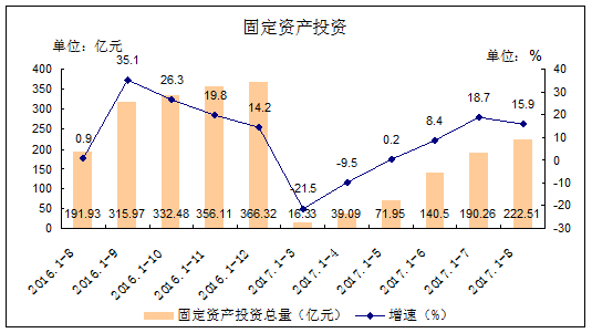 1-8月,完成固定资产投资222.51亿元,同比增长15.9%,较上年同期上升15.0个百分点,较1-7月下降2.8个百分点。