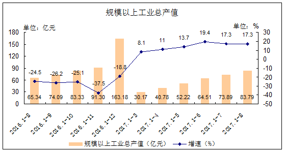 1-8月,规模以上工业总产值完成83.79亿元,同比增长17.3%,较上年同期上升41.8个百分点,较1-7月持平。