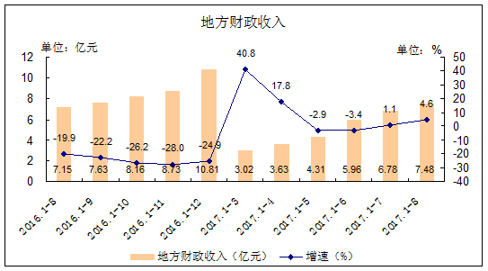 1-8月,地方财政收入7.48亿元,同比增长4.6%,较上年同期上升24.5个百分点,较1-7月上升3.5个百分点。