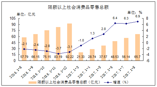 1-8月,限额以上社会消费品零售总额完成65.70亿元,同比增长6.9%,较上年同期上升9.0个百分点,较1-7月上升0.6个百分点。