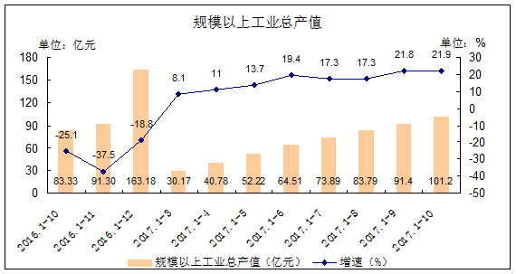 1-10月,规模以上工业总产值完成101.20亿元,同比增长21.9%,较上年同期上升47.0个百分点,较1-9月上升0.1个百分点。