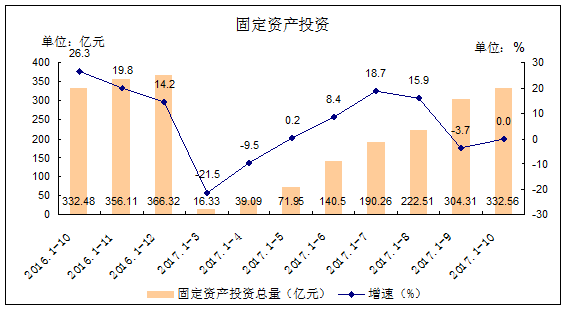 1-10月,完成固定资产投资332.56亿元,与上年同期持平,增速较上年同期回落26.3个百分点,较1-9月上升3.7个百分点。