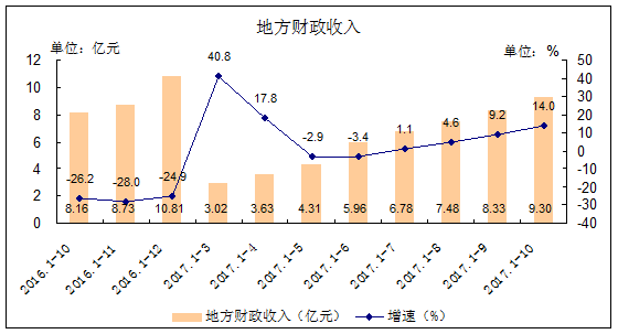 1-10月,地方财政收入9.30亿元,同比增长14.0%,较上年同期上升40.2个百分点,较1-9月上升4.8个百分点。