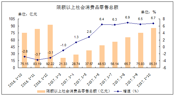 1-10月,限额以上社会消费品零售额完成85.31亿元,同比增长6.7%,较上年同期上升9.5个百分点,较1-9月上升0.2个百分点。