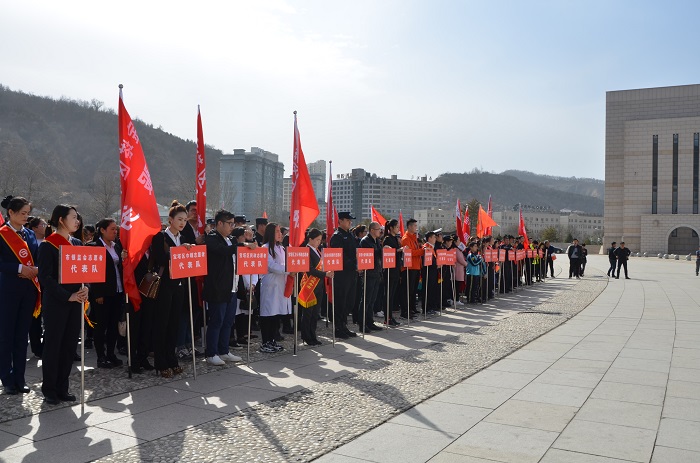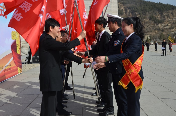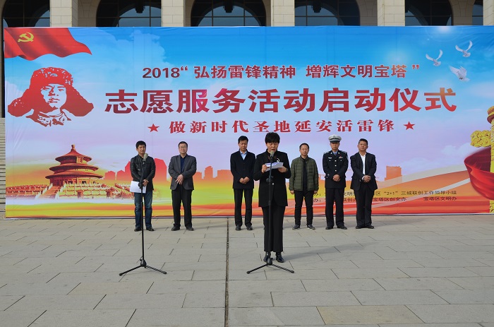 3月5日,是毛泽东主席“向雷锋同志学习”题词55周年和第19个“中国青年志愿者服务日”。当天,由区精神文明建设工作委员会、区“2+1”三城联创工作领导小组主办,区联创办、区创文办、区文明办承办的2018“弘扬雷锋精神、增辉文明宝塔,做新时代圣地延安活雷锋”志愿服务活动启动仪式在延安革命纪念馆广场隆重举行。邀请陕西银监局延安银监分局党委书记、局长戴立勇,市文明办副主任常海东,市交通局副局长李成伟,市交警支队纪检书记牛保东,市道德模范爱心公益协会秘书长庞军出席,区委常委、宣传部长、区“2+1”三城联创工作领导小组副组长常延丽出席并讲话。市、区24支行业志愿者团队及18个乡镇、街道分管负责人共计1100余人参加了仪式。仪式中,宣读了学雷锋志愿服务活动总体方案,志愿服务活动倡议书;出席领导向市交通、团区委、区教体等6支志愿者服务队进行了授旗,银监局、农商银行等4个志愿者服务队代表进行了表态发言。