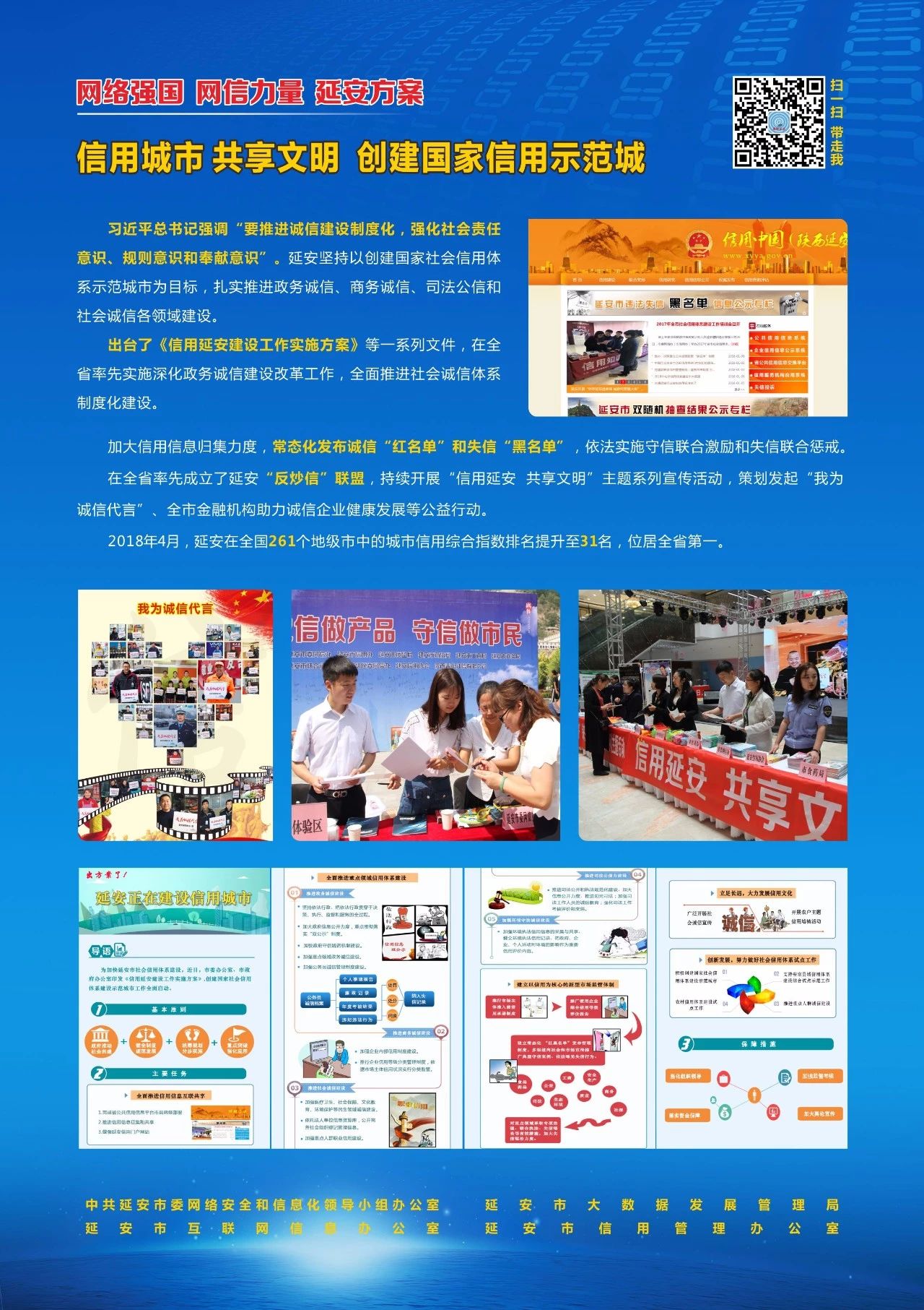 记者从市委网信办(市信用办)了解到,延安把创建国家社会信用体系建设示范城市纳入全市重点工作,把政务诚信建设纳入全市深改任务,紧紧围绕“政务、商务、社会诚信和司法公信”四大领域,建立完善信用制度,加强信用信息归集共享,探索建立了信用“红黑名单”常态化发布管理机制,积极推行信用信息在政府管理服务中的试点应用。深入开展“信用延安 共享文明”线上线下主题系列宣传活动,努力提高全社会信用意识和诚信水平。目前延安已制定了探索开展守信激励创新试点实施方案,积极探索建立公务人员诚信档案和开展“信易批”“信易贷”“信易医”等“信易+”试点,努力为延安实现追赶超越提供有力的社会信用支撑。
