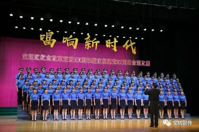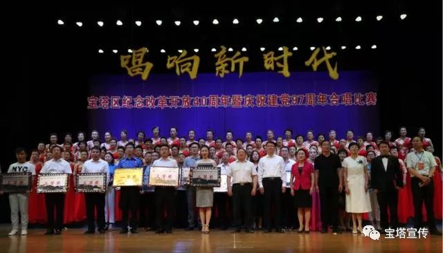 6月27日至6月28日,宝塔区在文化艺术中心礼堂举办纪念改革开放40周年暨庆祝建党97周年“唱响新时代”合唱比赛。全区25支代表队参加了此次比赛。 杜甫川小学少儿合唱团、延安市博爱医院合唱团、“宝塔之声”合唱团作为助唱参加。