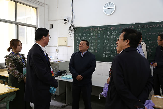 刘景堂一行认真检查了考点周边交通管制、安全保卫、医疗救护、应急处置等工作,并来到考务室,详细询问高考监考组织情况,随后走进视频监控室,查看高考考场实时状况。